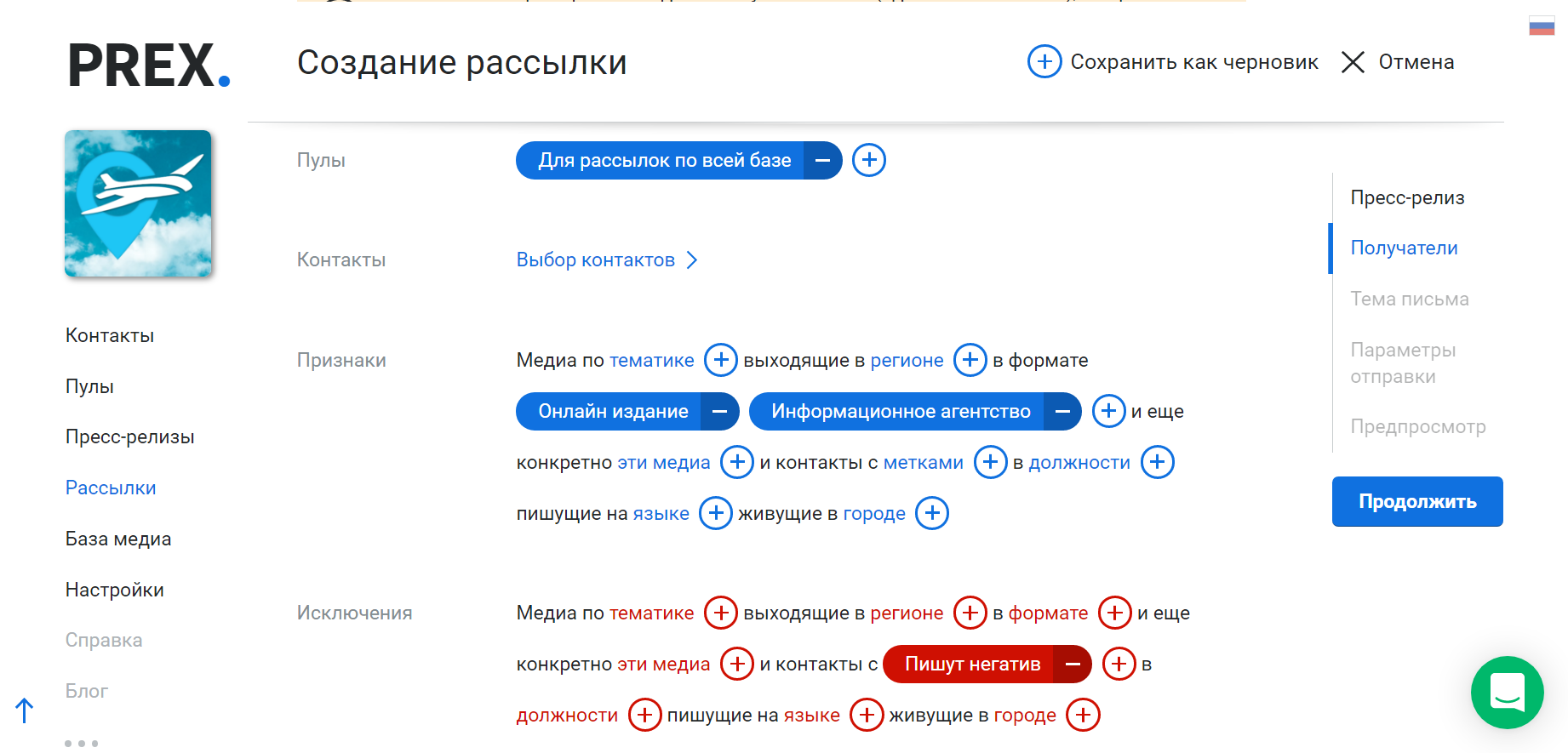 Указанные тематические предпочтения, метки, а также принадлежность журналистов к тому или иному пулу позволяют настроить таргетированную рассылку на этапе выбора получателей вашего сообщения.